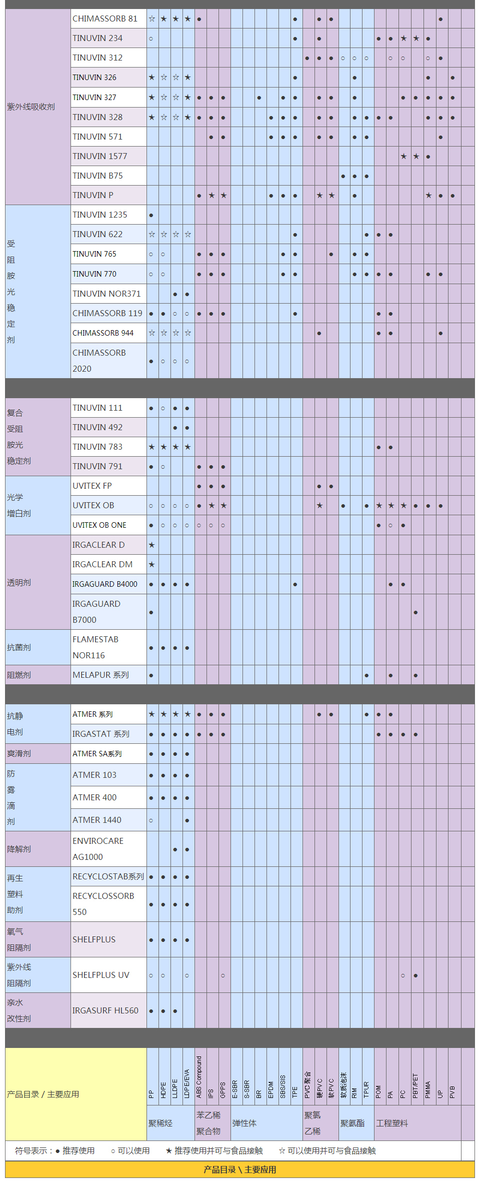 產(chǎn)品分類:抗氧劑 輔助抗氧劑 復合抗氧劑 熒光增白劑 光穩(wěn)定劑 抗靜電劑 開口劑 紫外線吸收劑 成核透明劑,光亮劑 抗菌劑 聚乙烯蠟 金屬鈍化劑